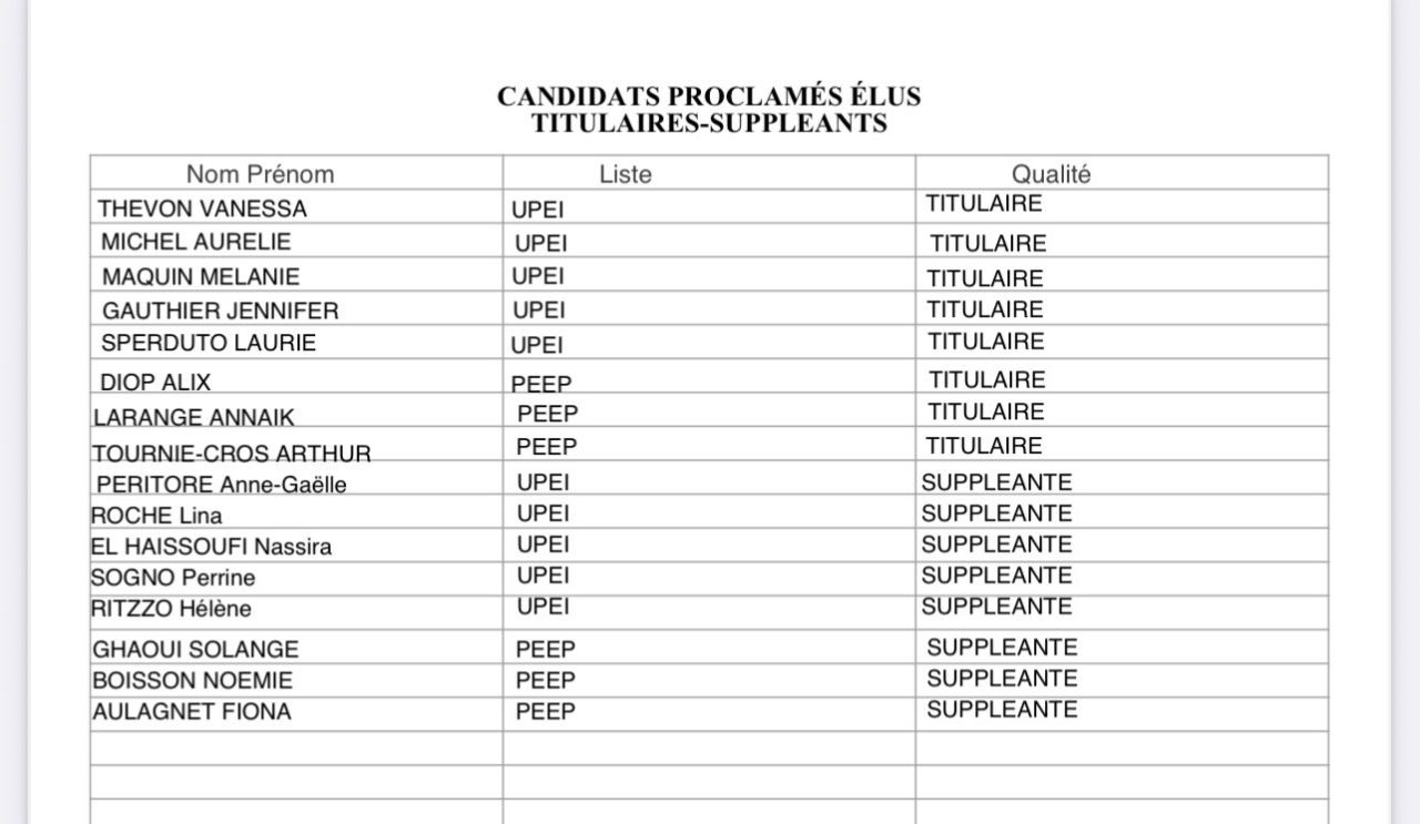 Les élections se sont très bien passées. 51 % de participation. Voici les résultats avec les parents d’élèves élus. Bon week-end.
